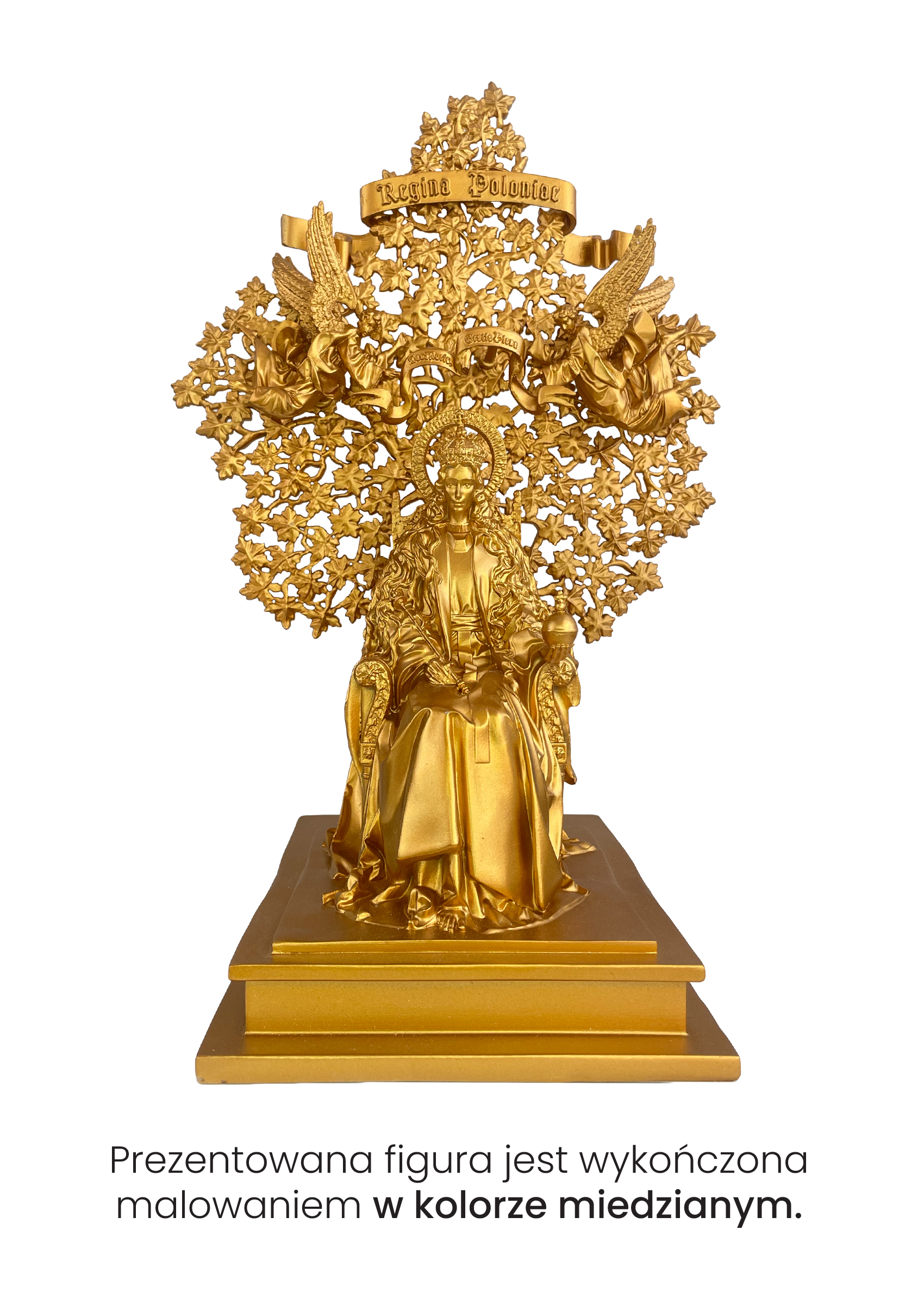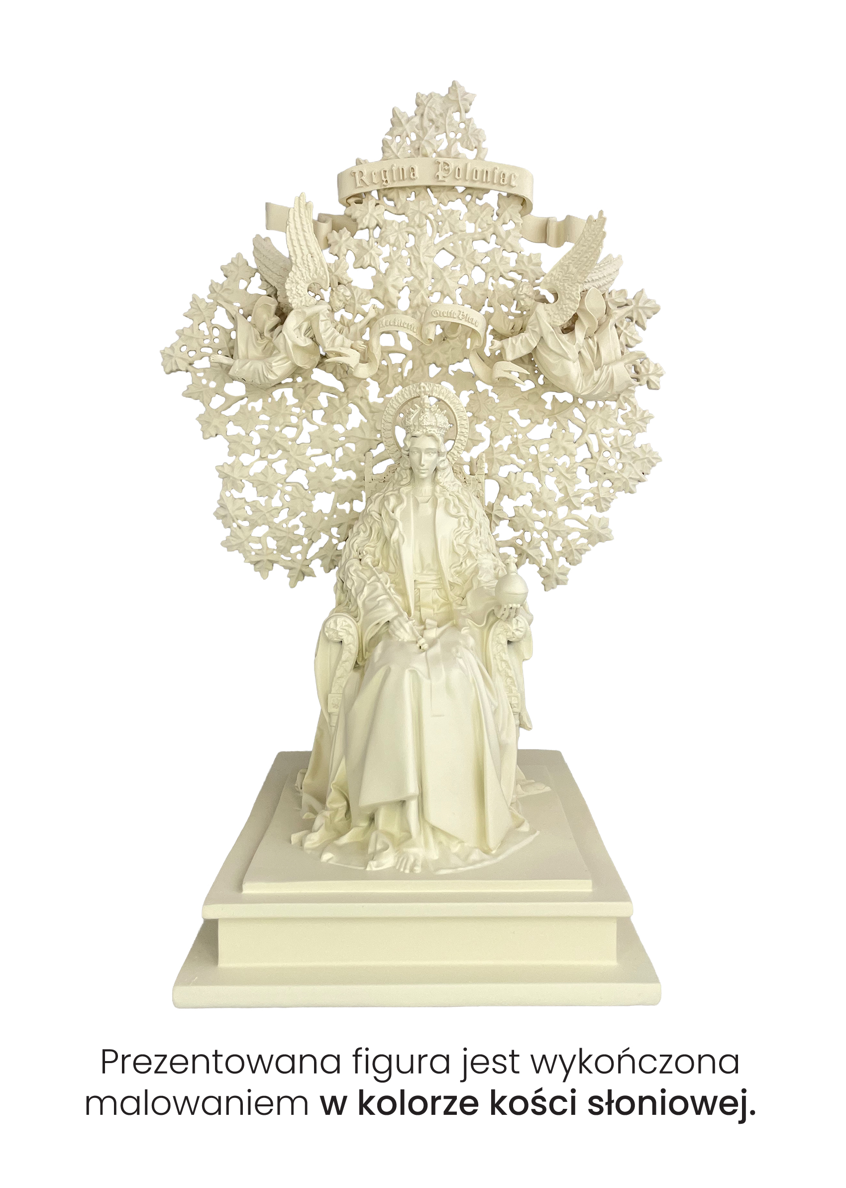 Figura Matki Bożej Gietrzwałdzkiej ukazuje Maryję zasiadającą na tronie, z koroną na głowie i berłem w dłoni – jako Królową i duchowy autorytet. Towarzyszą Jej aniołowie, podkreślający niebiański charakter objawień Gietrzwałdzkich. W tle znajduje się symboliczne drzewo, znak życia, ciągłości i Bożego planu zbawienia. Cała kompozycja tworzy spokojny, kontemplacyjny wizerunek o wyraźnym znaczeniu teologicznym.Figura stanowi nowe, a zarazem najbliższe źródłom objawień gietrzwałdzkich ujęcie tego wydarzenia. Zgodnie z relacjami wizjonerek Maryja ukazała się siedząca na tronie, w postawie królewskiej, spokojnej i pełnej autorytetu